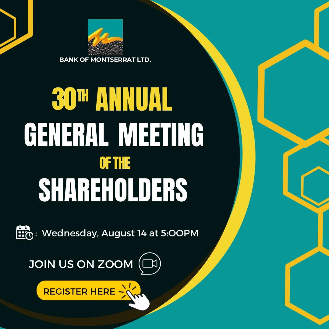 Notice is hereby given that the 30th Annual General Meeting of the shareholders of Bank of Montserrat Limited will be held on Wednesday 14th August, 2024 commencing at 5:00 p.m. at